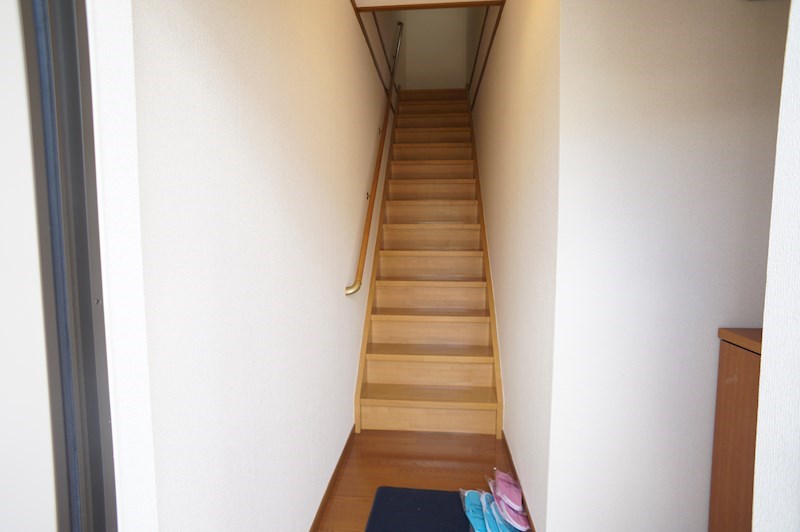 玄関ドアを開けたら玄関、靴箱(納戸が付いているものもある)があるのみで目の前にいきなり階段があらわれます。